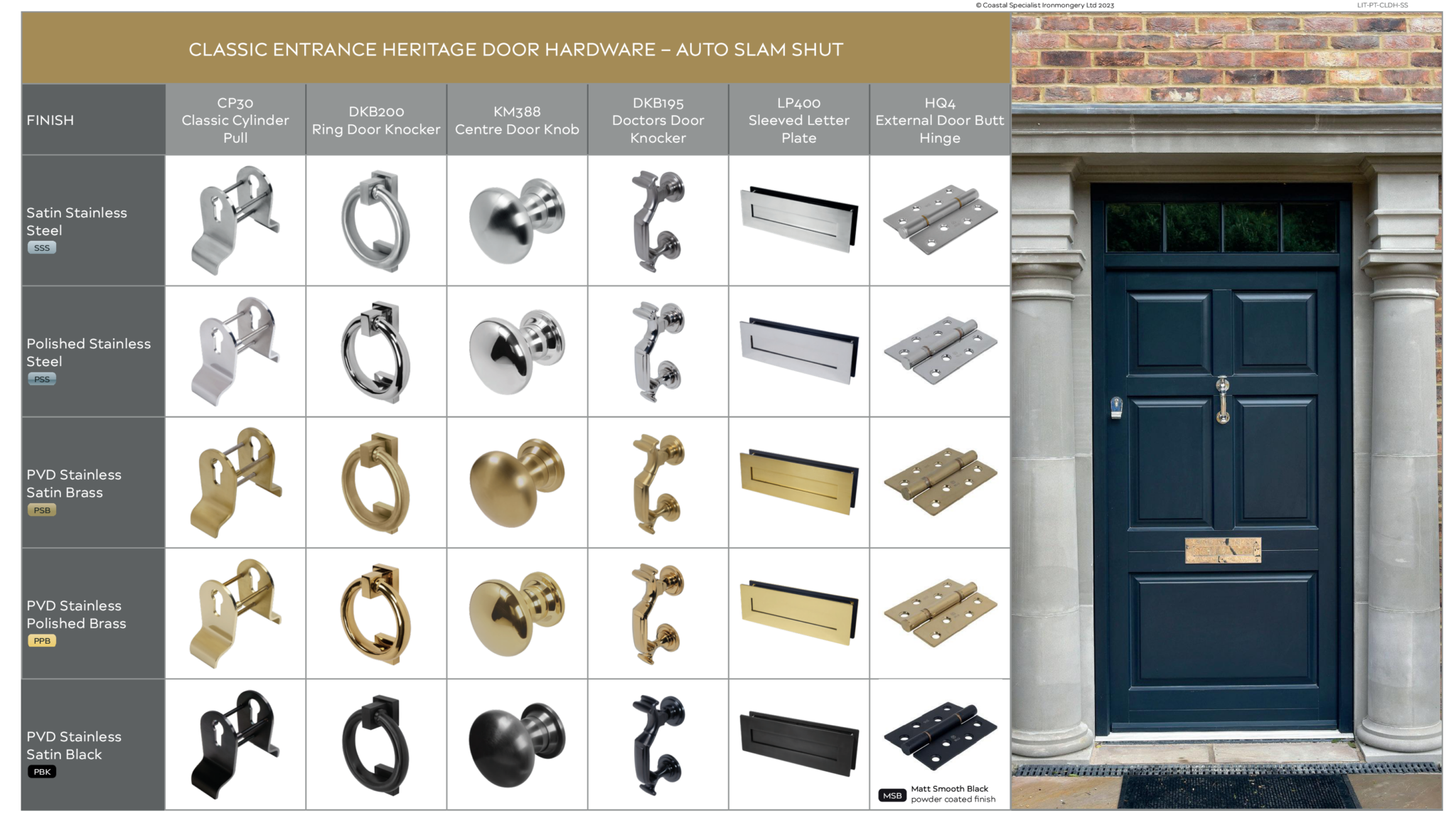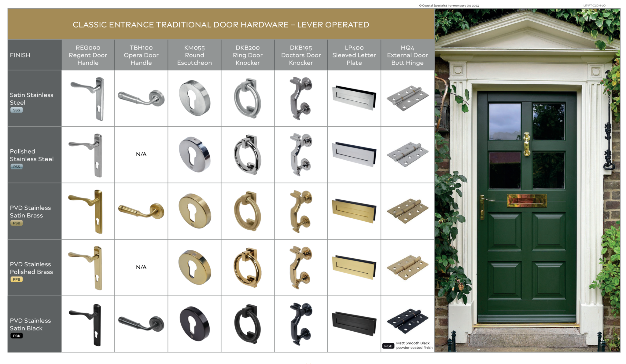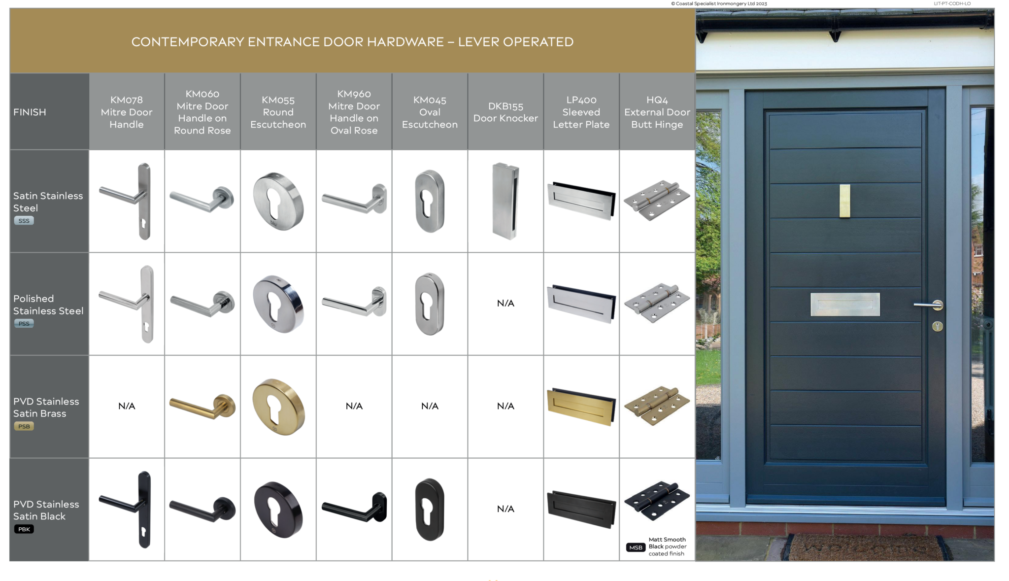 We can finish and install any range of ironmongery. However, our preferred hardware manufacturers are Coastal Hardware as we can offer a 5-year guarantee on these products.